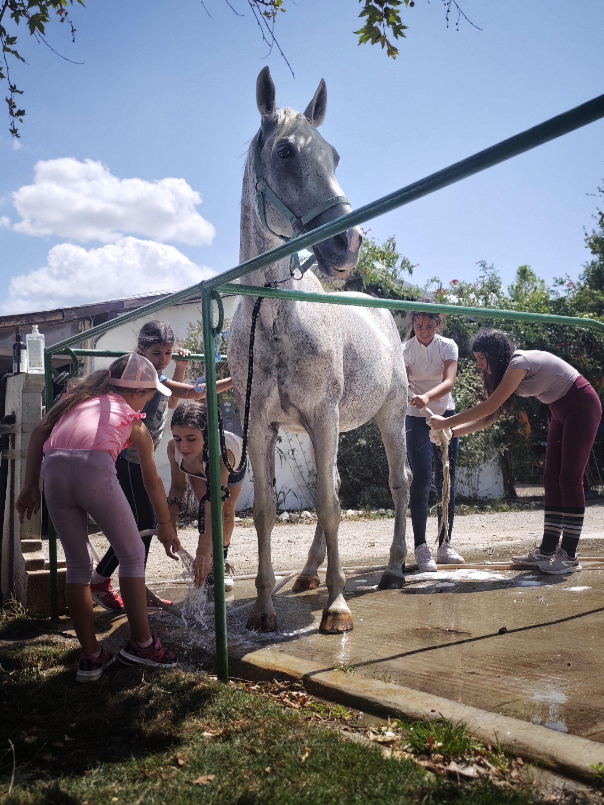 4. Caii fac parte din viata noastra – invatam copii sa trateze caii ca pe membri ai familiei si parteneri, sa nu ii considere unelte de sport, incurajam empatia si crearea unei relatii cu calul, grija pentru stara de bine a calului. Ii invatam pe cursanti sa rasplateasca caii cu momentel placute lor: sa ii tina la iarba, sa ii mangaie si sa ii scarpine, sa le ofere dusuri reci pe timp de vara, gustari sanatoase si torturi de ziua lor indiferent de sezon. Aceste gesturi simple construiesc o relatie frumoasa.